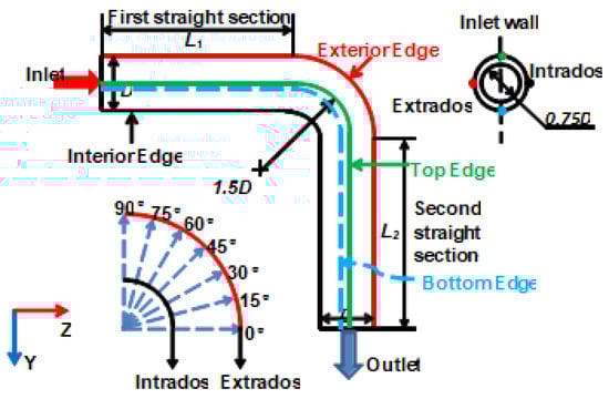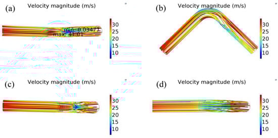 Figure 5 shows the distribution of streamlines in pipeline, where the color of the streamline indicates the velocity magnitude. From Figure 5a, the maximum flow velocity (41.01 m/s) and the minimum flow velocity (1.609 m/s) are concentrated in the elbow section. From Figure 5b, the location of maximum flow velocity and minimum flow velocity is close to the intrados surface. The velocity of gas increases and then decreases near the intrados surface, however, the velocity of the gas decreases and then increases near the extrados surface. From Figure 5b,c, the streamlines gradually were concentrated and many flow lines were terminated in the second straight section. Furthermore, most of streamlines are concentrated near the intrados surface and formed a ε-shape distribution. From Figure 5d, the streamlines near the extrados in elbow are constrained by the wall and diverged into the second straight section, and the middle streamlines has a relatively high velocity.