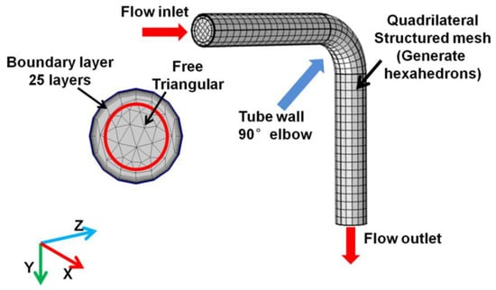 The unstructured meshes are constructed in the computational domain. An example mesh of the pipeline is shown in Figure 3. The free triangular grid is constructed the inlet boundary (0.75 D). The sweep mesh is adopted because of the long narrow pipe structures and the grid processor along the pipeline to generate the structured quadrangle mesh (generate hexahedron). A boundary layer grid with 25 layers and 1.25 stretch factors is used to discretize the tube in order to ensure adequate analysis of fluid flow and particle erosion behavior near the tube wall.