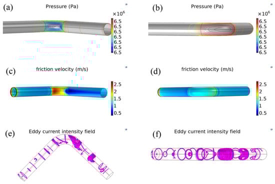 Figure 4a,b shows the pressure distribution contour of the pipeline. Although the pressure in the entire pipe is set to a constant (6.5 MPa), the pressure on the extrados surface (6.51 MPa) is higher than that on the intrados surface (6.49 MPa). Figure 4c,d shows the distribution of the friction speed along the wall. The friction speed on the elbow surface is usually higher than that on the wall of straight sections. The friction speed on the intrados surface of elbow is higher than that on the extrados surface. The friction speed on the intrados surface of the first half of elbow is higher than that of the second half, however, the distribution of friction speed on the extrados surface is contrasting. Figure 4e,f shows the turbulence intensity distribution of gas. The turbulence intensity is strong and complex at the elbow section. In addition, the turbulent intensity coil is formed into a concave shape in the second straight section, and the coil points to the intrados surface.