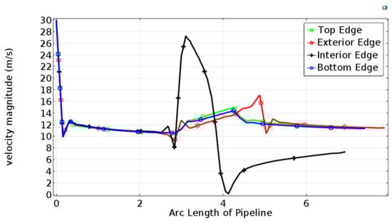 Although the problems caused by the synergistic effect of erosion–corrosion are serious, the erosion–corrosion mechanism of the elbow, as influenced by the velocity and pressure, is still not thoroughly understood because of its complexity. Numerical simulations are often used in erosion–corrosion research []. The velocity difference on the four featured edges near the inlet is due to high wall lift force. The slow decline of speed in the first straight section is attributed to the fact that the characteristics of the boundary layer flow field and the turbulent core area is quite different. Boundary layer has blocking effect on the fluid motion and the gradient of each flow parameter is very large leading to the formation of lift and affects the velocity of the wall.