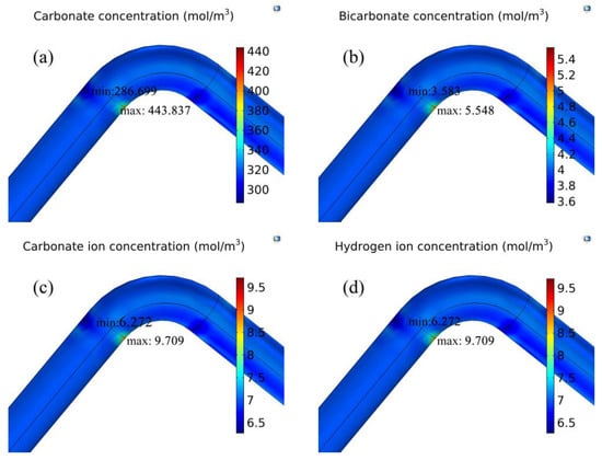 Figure 7 shows the concentration distribution of chemical substances in the pipe. The concentration of substances is accumulated at the entrance of the elbow, especially near the intrados surface. Carbonic acid concentration reaches 443.84 mol/m3. Hydrogen ion concentration is maintained at a constant value of 9.70 mol/m3. The highest concentration of carbonate ions reaches 9.71 mol/m3. The maximum concentration of bicarbonate ion is 5.55 mol/m3. However, near the extrados surface, the accumulation of substance concentration is relatively small. All simulations were performed by the experimental parameters in Table 1.
