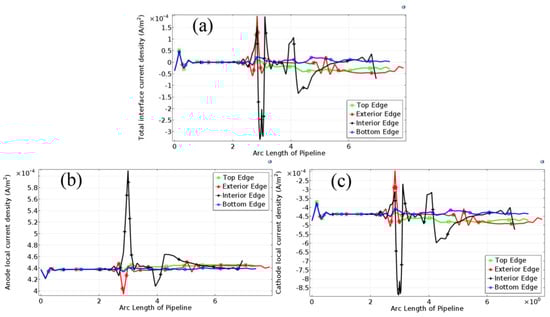Figure 8 shows the variations in current density of four feature edges along the wall from the inlet to the outlet of the pipe. Figure 8a shows the total current density of the interface; Figure 8b shows the anode current density and Figure 8c shows the cathode current density.