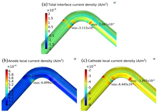Figure 9 shows the current density distribution caused by electrochemical reactions under turbulence throughout the pipeline. From Figure 9a, the serious part of the total interface current density is mainly concentrated at the intersection of the elbow and the straight sections. From Figure 9b, the most serious metal loss caused by the electrochemical corrosion is concentrated at the junction of the elbow and the first straight section. From Figure 9c, the serious part of the cathode local current density is similar to the part of the total interface current density.