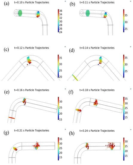 Three-dimensional diagram of particle trajectories in the pipeline (the color indicates the speed). (a) t = 0.10 s particle trajectories; (b) t = 0.11 s particle trajectories; (c) t = 0.12 s particle trajectories; (d) t = 0.14 s particle trajectories; (e) t = 0.16 s particle trajectories; (f) t = 0.18 s particle trajectories; (g) t = 0.21 s particle trajectories; (h) t = 0.24 s particle trajectories.