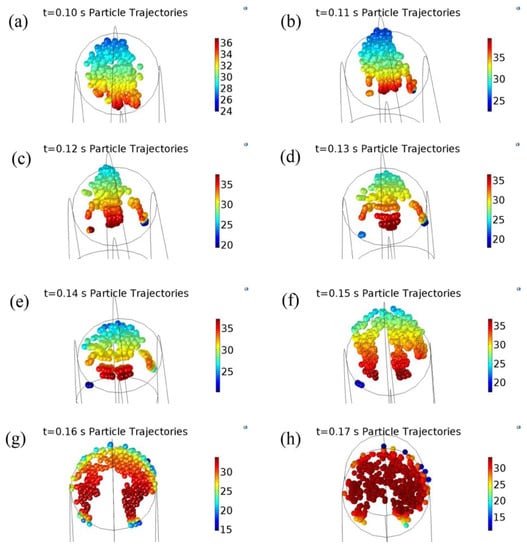The trajectory of particles hitting the wall (the color indicates the speed). (a) t = 0.10 s particle trajectories; (b) t = 0.11 s particle trajectories; (c) t = 0.12 s particle trajectories; (d) t = 0.13 s particle trajectories; (e) t = 0.14 s particle trajectories; (f) t = 0.15 s particle trajectories; (g) t = 0.16 s particle trajectories; (h) t = 0.17 s particle trajectories.