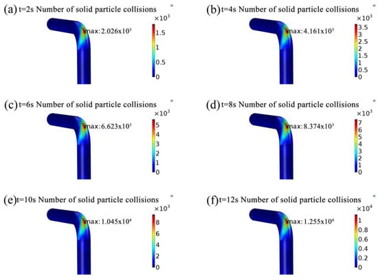 The number of solid particles hitting the wall. (a) t = 2 s number of solid particle collisions; (b) t = 4 s number of solid particle collisions; (c) t = 6 s number of solid particle collisions; (d) t = 8 s number of solid particle collisions; (e) t = 10 s number of solid particle collisions; (f) t = 12 s number of solid particle collisions.