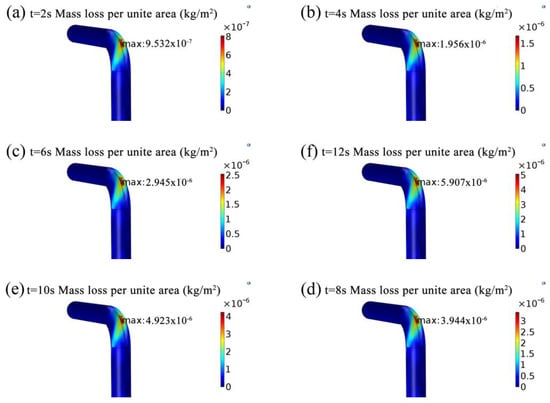 The evolution of mass loss per unit area (kg/m2). (a) t = 2 s mass loss per unit area; (b) t = 4 s mass loss per unit area; (c) t = 6 s mass loss per unit area; (d) t = 8 s mass loss per unit area; (e) t = 10 s mass loss per unit area; (f) t = 12 s mass loss per unit area.