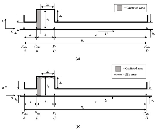 Schematic of the parallel sliding single-pocket bearing considering cavitation for the case: (a) Slip condition and (b) No-slip condition. Note: The meaning of each parameter is shown in Table 1 and nomenclature.
