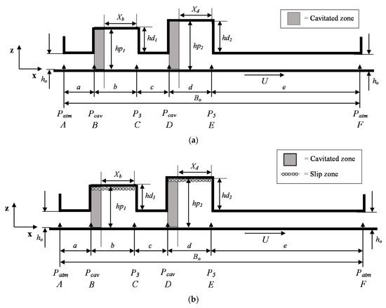 Schematic of the parallel sliding double-pocket bearing considering cavitation for the case: (a) Slip condition and (b) No-slip condition. Note: The meaning of each parameter is shown in Table 2 and nomenclature.