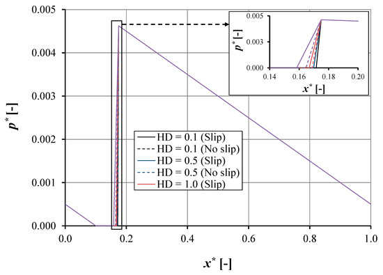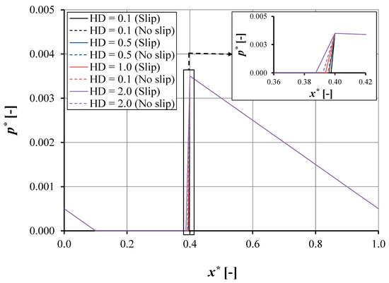 Figure 3 depicts the comparison of the pressure distribution of the single-pocketed bearing between the slip case and the no-slip case varying the pocket depth. In this section, the parameter HD is introduced as the normalized pocket depth. HD is defined as the ratio of pocket depth, hd, over the land film thickness, ho. Furthermore, the load support, w, is of particular interest. Here, w is defined as the integration of the pressure over the surface area.