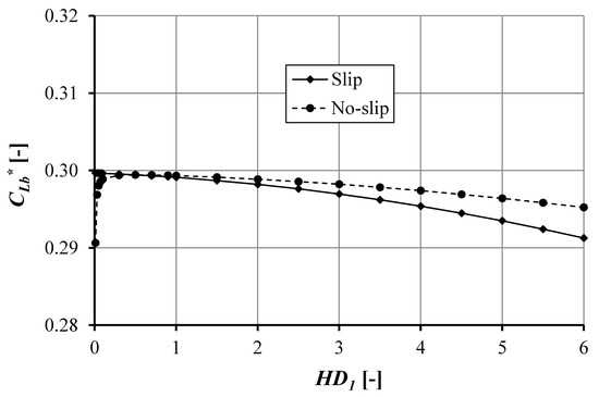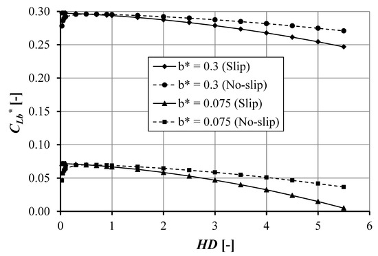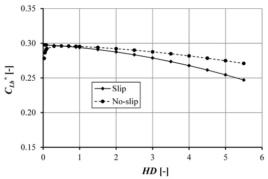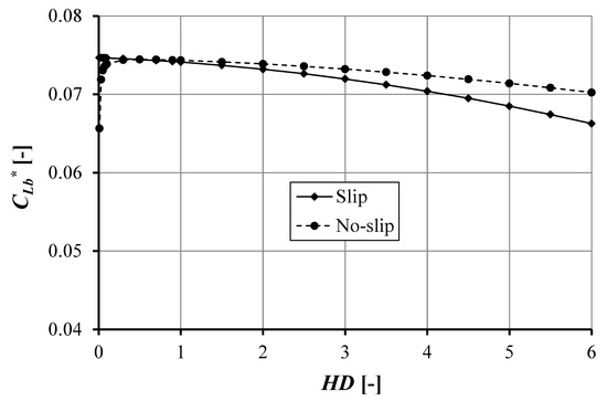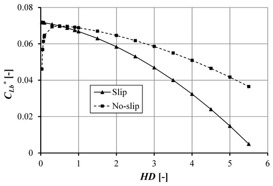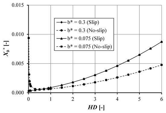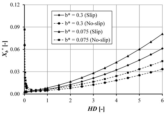 From a design and manufacturing point of view, to have the condition of no-slip in the inlet is not recommended because it leads to cavitation, which may reduce the lubrication performance of the sliding contact: for the no-slip case, the increase in HD will produce an increase-then-decrease profile of the cavitation area, CLb. This indicates that there will be an optimum value for HD after which an increase in HD will reduce the CLb significantly. Below this optimal HD, a decrease in HD will also reduce the CLb considerably. This is a contrary result to that of the slip case. Based on Figure 4, it is seen that the critical HD is around 0.5. Analyzing Figure 4, boundary slip reduces CLb more than that for no-slip (up to 86.57%). However, this condition prevails when HD is larger than the critical HD. For example, for HD = 4, compared with the no-slip bearing, slip gives a 36.40% lower value in CLb, and if this result is associated with the load support W*, the improvement in W* by slip is around 2.47% larger.