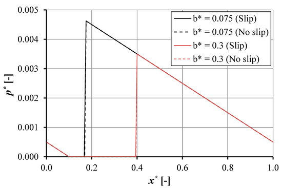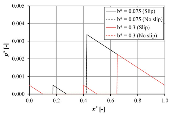 Figure 7 shows the pressure distribution for the slip and no-slip condition with pocket depth HD = 1, pocket length b = 0.0015 and 0.006 m. The pressure distribution for the slip and no-slip condition shows a similar trend. The pressure distribution decreases to the cavitation pressure, then increases to maximum pressure P3, and decreases toward the atmosphere pressure at the exit land length. The maximum pressure, P3, is of particular interest, it decreases with increasing pocket length. From the figure, it can be seen that the maximum pressure distribution, P3, for different pocket lengths, b, has the same gradient; thus, minimizing the pocket length will increase the maximum pressure, P3, in the cavitation condition. However, it should be noted that there is a threshold in this increase in P3 as a function of a decreasing pocket length, b. When cavitation does not occur for a specific pocket pattern, in particular, with a very low pocket length, the maximum pressure may reduce. For a more detailed discussion about this threshold, the reader is referred to reference [49]. The slip condition will decrease the cavitation area. However, the reduction in cavitation area is not significant. The slip condition will not significantly affect the maximum pressure distribution, P3, for the same pocket length.