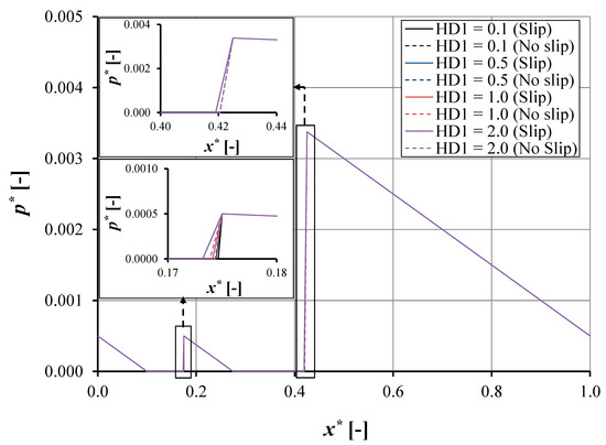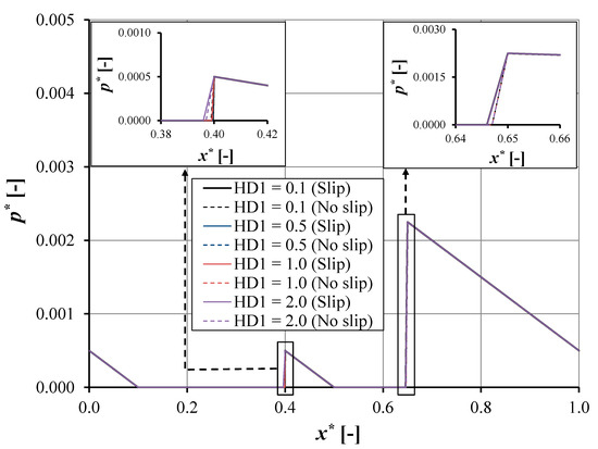 Figure 10 shows the pressure distribution of the double pocket bearing (Figure 2) for both the slip and the no-slip condition. The figure describes some findings: firstly, the pressure distribution shows a similar trend for both the slip and the no-slip condition. The maximum pressure, P5, occurs in the second pocket, the value of the maximum pressure is the same for the slip or no-slip condition (P5* = 0.0034). The maximum pressure in the first pocket is equal to the atmosphere pressure. Secondly, the pressure distribution in the first or second pocket is not influenced by the first pocket depth, HD1. The variation of the first pocket depth, HD1, will influence the length of the cavitation area in the first pocket (see inset of Figure 10). However, it does not affect the cavitation area in the second pocket (see Equation (A24) in Appendix A). Consequently, the length of the cavitation area is not a function of the first pocket depth, HD1. Thirdly, the slip condition will affect the cavitation area in the first or second pocket, in other words it reduces the cavitation area.