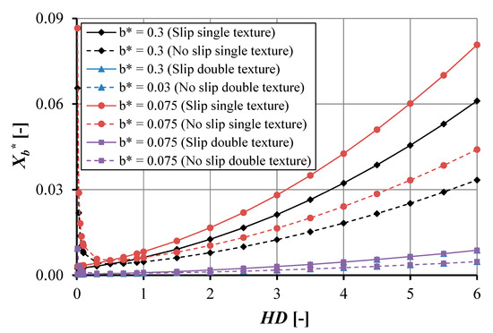Figure 8 gives the cavitation area as a function of pocket depth. The cavitation area increases with increasing pocket length. However, the cavitation area shows a similar trend with the pocket depth for the slip and the no-slip condition. Figure 9 depicts the no-cavitation area, Xb, as a function of pocket depth. For the slip condition, the no-cavitation area increases with increasing pocket depth, HD. However, it decreases with increasing pocket length, b. In other words, the load support will increase for a lower pocket length, b, and a higher pocket depth, HD. In the no-slip condition, a minimum Xb occurs when the pocket length, HD, is equal to approximately 0.5. For HD > 0.5, Xb increases with increasing pocket depth, HD. As for the slip condition, on increasing the pocket length, b, for the no-slip condition Xb will decrease. From Figure 9, it can be seen that the slip condition improves the no-cavitation area. The result is consistent with the results mentioned earlier and the work of Bayada et al. [12], i.e., slip will reduce the cavitation area.