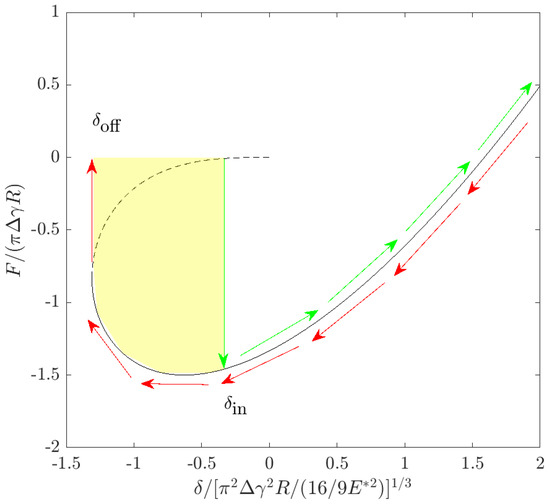 The load–penetration curve predicted by Johnson, Kendall, and Roberts (JKR) theory. The loading (unloading) path is denoted by green (red) arrows. Positive penetration values correspond to indentation and compressive force. Jump into contact occurs at a penetration . The unloading path overlaps the loading one, but jump out of contact occurs at a critical penetration . The yellow area denotes the hysteretic energy loss.