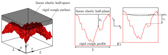 Let us consider a rigid rough surface approaching an elastic half-space (Figure 2). According to JKR formalism, the normal displacement of the elastic half-space at the location of the asperity i is