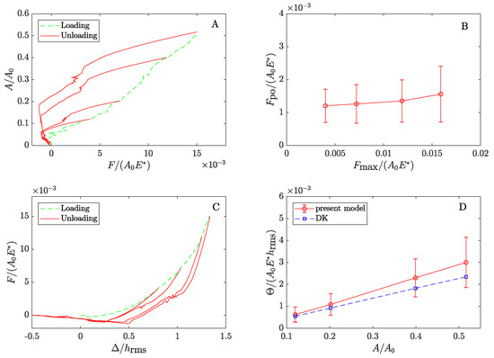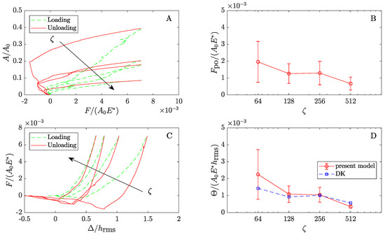In an approach–retraction cycle, the magnitude of hysteretic losses is equal to the area between the loading and unloading curves, where is the mean penetration of the rough surface in the half-space. Figure 3C shows the evolution of the dimensionless contact force with the normalized penetration . Recent experiments [5,11] suggest that, in presence of surface roughness, increases linearly with the penetration (or in a similar way with the true area of contact A). Such phenomenon is known in literature as depth-dependent hysteresis. Figure 3D shows the increase of the dimensionless energy loss with corresponding to the maximum applied loads. The model captures the linear relation between and and the analytical predictions given by DK’s model [14], as adapted to the present case (see Appendix A), are coherent with our numerical results.