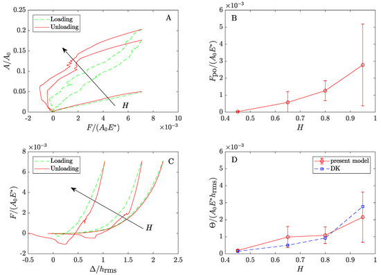 A second set of simulations has been performed on surfaces with fixed m, and different Hurst exponents . We have fixed again the maximum applied load . An increase in H leads to a decrease in RMS gradient, thus explaining why the area increases with H for a fixed load (Figure 5A). Figure 5B shows that the pull-off force is destroyed at low H; the same trend has been observed in [42], where the adhesive contact between a parabolic indenter with superimposed roughness and an elastic half space has been studied in the JKR-limit. Figure 5C shows how the relation modifies with H. In particular, at loading and unloading paths overlaps thus showing vanishing adhesive hysteretic loss , which is strongly affected by the Hurst exponent as shown in Figure 5D. Notice results are more scattered for surfaces with lower fractal dimension as finite-size effects related to the absence of a low-wavenumber roll-off (or cut-off) region are exaggerated at higher values of H.