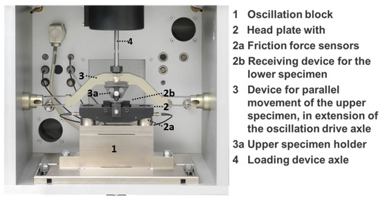 The tests are carried out on SRV of the fifth generation (Figure 1). This differs from its predecessor models by a changed electronic concept (Field Programmable Gate Array system, FPGA) with the latest user software and further mechanical developments. However, the SRV basic principles, which are binding for compliance with all relevant standards, still apply: generation of motion through the electromagnetic linear motor, applying normal force through a gear shaft spring system, conversion of friction force into the coefficient of friction directly in the amplifier electronics, acquisition of friction force through piezoelectric sensors (Figure 2). The FPGA system allows many parallel data operations as well as a flexible parametrisation and adjustment of electronic behavior through well-engineered firmware concepts. Thus, time-critical secondary resulting parameters are calculated directly in the hardware without time falsification and are recorded as measuring channels in the evaluation software.