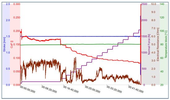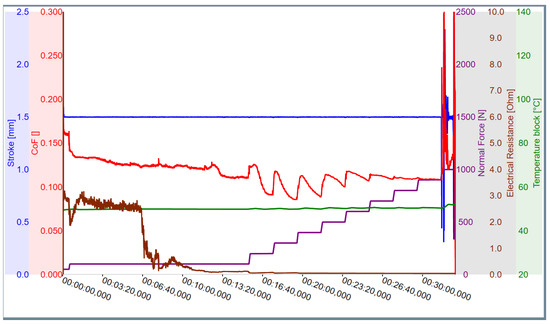 Figure 4 illuminates the evolution of electrical contact resistance (brown curve) during a load step test. After each increase in normal force (purple curve), a short drop in electrical contact resistance is observed, which recovered fast. Some load steps before adhesive failure, the electrical contact resistance continuously decreased, indicating the upcoming scuffing. For the grease represented in Figure 5, changes in normal force (purple curve) hardly influence the level of the electrical resistance. The sharp drop in the electrical contact resistance at 1200 N signals up-coming premature scuffing because at this load stage, the wear of the reaction layers is faster than their rebuilding. Figure 6 illuminates an opposite behavior where, during running-in, the electrical contact resistance collapsed without any effects in the signal of the coefficient of friction and stroke. No indications of adhesive failure were shown in terms of friction and stroke because this reaction layer is of conductive nature. Figure 4 and Figure 5 show that the stroke remained smooth over the entire test until failure occurred.