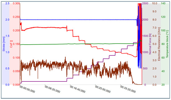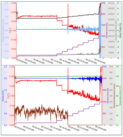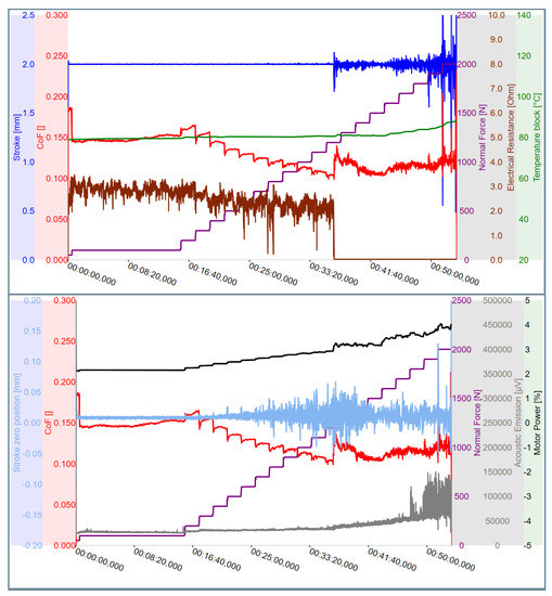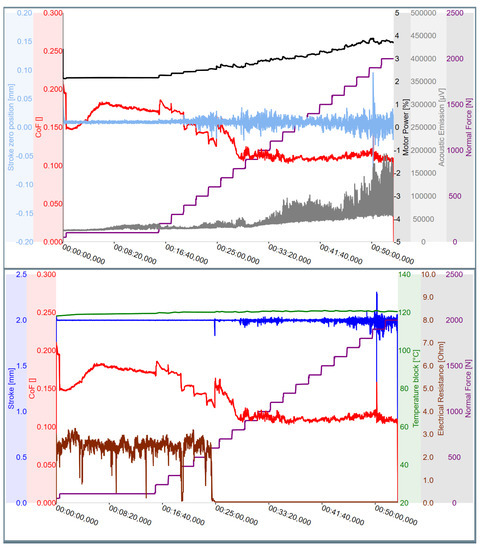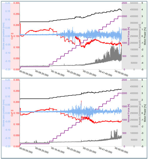 After running-in, the friction in Figure 8 is lowered by each load increase. As in Figure 7, the friction decreased in Figure 8 continuously with increasing load, until suddenly it jumped up at 500 N. At 500 N, the coefficient of friction with the stroke indicated a very short instability of which the origin is permanent as per the electrical contact resistance signal (brown curve). Within the test procedure, Figure 8 shows that the development of acoustic emission and stroke zero position (light blue curve) indicated an early upcoming change in the frictional EP behavior. Two to three load steps prior to the stoppage of the machine, the acoustic noise activity, and the oscillation of the stroke and zero stroke position indicated signs of changes into the wear mechanism of adhesive wear. The evolution of the power consumption of the drive unit (black) follows the load increase and changes above 600 N into a distorted shape but was not as indicative as the other measurements (compared with Figure 7, below). The electrical contact resistance displays exactly at 600 N the clear loss of solid tribofilm formation, even if the test continued until 2000 N. On the other hand, beginning between 400 and 500 N, the zero-stroke position and the acoustic emissions advertised the beginning loss of extreme pressure protection. By comparing the stroke in the lower diagram of Figure 8 with the stroke zero position at the top of Figure 8, it can be deduced that the stroke zero position is a forward indicator in view of the stroke itself.