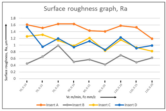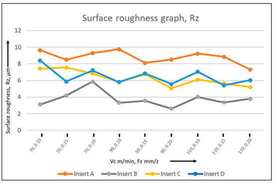 ANOVA for Fz force shows that the three significant factors are feed rate (41.45%), insert geometry (22.38%), and cutting speed (21%) in that order, whereas for the Fy force (tangential or cutting force), the contribution of feed is around 92.62%, and the insert geometry is least significant with 0.59%. This shows the importance of the micro-geometry of the wiper edge on the Fz force. From the main effect plot for Fz force (Figure 10), it can be interpreted that Insert D gives the lowest axial force followed by Insert B, Insert C, and Insert A. The Insert D without chamfer is supposed to penetrate and shear the workpiece with more ease than the other inserts. Among the other three inserts, as Insert B has a sharp chamfer, it gives the least force, whereas there is very little difference in the force values of Insert C and Insert A. Denkena et al. [30] have shown that increasing the cutting-edge radius increases the passive forces, which results in higher mechanical load on the machined surface. It also induces a high compressive residual stress. A similar effect can be seen in the edge with a chamfer. Choi [31] has proved that apart from chamfer width, the angle of chamfer also influences the microhardness and residual stress on the machined surface. The higher the angle, the higher the stress and surface hardness.