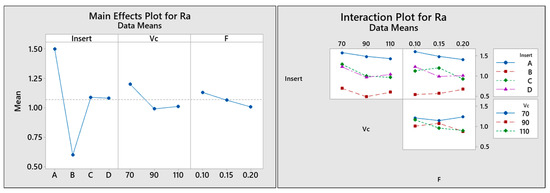 From the graphs (Figure 3 and Figure 4), it is evident that Insert B (sharp chamfer on the cutting edge and sharp on the wiper edge) gives the lowest Ra and Rz values (lower the better), whereas Insert A (radiused chamfer on the cutting edge and radius on the wiper edge) gives the highest Ra and Rz values. There is a very less or negligible difference in the surface roughness values produced by both Insert C and Insert D. Minitab 19 software was used to perform full factorial general linear model Analysis of Variance (ANOVA) study and to understand the significance of each variable on the surface roughness. The main effect and interaction plot of Ra and Rz are shown in Figure 5 and Figure 6, respectively. ANOVA analysis for Ra and Rz are shown in Table 6 and Table 7, respectively.