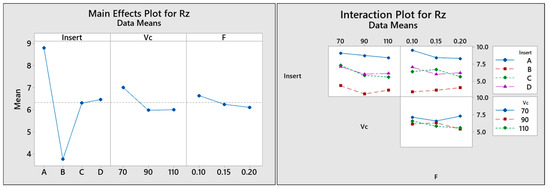From the main effect and interaction plots (Figure 5 and Figure 6), it can be interpreted that Insert B gives the superior surface finish values, whereas Insert A produces the least quality surface, which is in line with the trend seen in the Figure 3 and Figure 4. The ANOVA table (Table 7) also confirms that the micro-geometry on the cutting and wiper edge has the highest significance of around 76% and 80.9% in determining the Ra and Rz values respectively followed by cutting speed with a significance of 6.65% and 5.95% respectively. Theoretically, the feed rate has a higher impact on the surface roughness rather than the cutting speed [21]. However, surprisingly, feed is seen as the third significant factor, which could be due to the presence of the wiper edge on all the four inserts, which tends to flatten the feed lines or peaks formed during cutting. The presence of a wiper facet on all the inserts and identical cutting condition used for the tests reconfirms that the variation in surface roughness is due to the variation in micro-geometry.