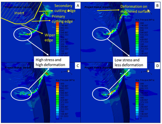 Figure 7 shows the stress concentration on the workpiece when the tool is in the cut. From the analysis, it is clear that a very high stress and hence high deformation on the machined surface are seen for Inserts A and C, whereas the stress concentration and deformation are comparatively lower on the surface formed by Inserts B and D. The FE analysis proves that Insert B generates lower stress and deformation zone on the workpiece followed by Insert D, which is the favorable micro-geometry to get a superior surface finish that is in line with the low Ra and Rz values seen in Figure 3 and Figure 4, respectively. This depicts the correlation between surface roughness and stress on the workpiece. It is also evident that the deformation and stress concentration on the surface formed by the wiper edge shows a distinct difference for all the four micro-geometries. In addition, the deformation on the trailing machined surface in Figure 7 shows the amount of stress on the workpiece.