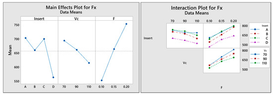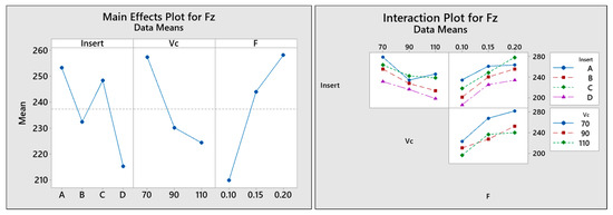 The main effect plots (Figure 8, Figure 9 and Figure 10) and ANOVA tables (Table 9, Table 10 and Table 11) show that the feed rate is the single most significant factor for the variation in forces. With the increase in feed rate, all the three force components increase linearly as the amount of material removed (MRR) increases. However, for the Fx and Fz forces, the micro-geometry is the second most significant factor, which shows the importance of the edge geometry on forces. Among all the four insert geometries, Insert D generated the least Fx force followed by Insert B. This is obvious, as the insert D without chamfer penetrates and shears the material easily and creates lesser resistance to the cut when compared to Insert B, which has a chamfer. Similarly, Insert A and Insert C with identical micro-geometry on the cutting edges gave higher but negligible differences in the force values, as seen in Figure 10. A similar trend was seen for the Fz forces as well. It can also be seen that increasing the cutting speed decreases all the three force components linearly, which is due to the thermal softening of work material at higher cutting speeds that make the tool easier to penetrate and shear [21]. Researchers have reported that cutting speed has the highest impact on the tool–chip interface temperature when compared to feed rate, which results in the softening of work material at the cutting zone. However, increasing the feed rate also results in increased chip thickness, which tends to carry more heat away from the cutting zone [29].
