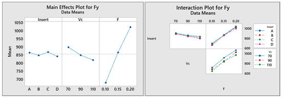 The main effect and interaction plot of all the three force components for the variations in micro-geometry, cutting speed, and feed are shown in Figure 8, Figure 9 and Figure 10 and ANOVA analyses are shown in Table 9, Table 10 and Table 11.