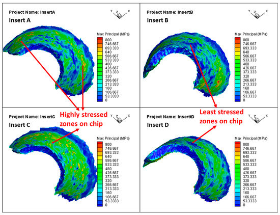 By analyzing the chip formed by inserts with different micro-geometries (Figure 11), it can be concluded that the chips created by Insert C are highly stressed which is seen as dark green and yellowish red patches on the entire surface of the chip followed by Insert A. The higher stress on Insert C and Insert A (large number of red and yellow zones in Figure 11) is in line with the high forces as seen in the main effect plot of forces (Figure 8, Figure 9 and Figure 10). The chip formed by Insert B and Insert D shows comparatively lower-stress regions (chips are mostly blue and green), which show the effect of micro-geometry on the ease with which the material is sheared. This also correlates with the stress zones seen on the workpiece in Figure 7.