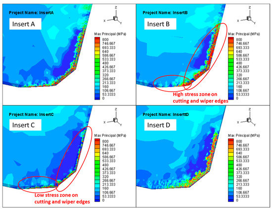 Apart from producing superior surface finish and the lowest forces, the primary objective of the micro-geometry is to maintain superior edge stability even during unfavorably machining conditions, so that the sudden breakage or chip-off can be prevented, which could make the tool unusable. So, finite element analysis was performed on all the four inserts (Figure 12) to study the stress concentration on the inserts. Generally, it is preferred to have the lowest possible maximum principal stress on the cutting edge to improve the stability of the cutting edge [32]. The higher stress concentration means that the edge is highly prone to breakage.