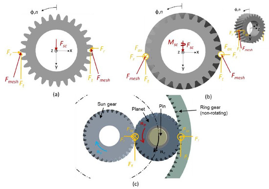 Figure 2 shows the red signed forces on the planet as well as the yellow signed components of the mesh forces. In the case of the straight gear in Figure 2a, the mesh forces feature a tangential Ft and radial Fr component. As the sum of the radial force components is zero, the bearing force Fsc is equal to the sum of the tangential forces. Both components of the mesh force contribute to an oval deformation of the planet. The magnitude of the oval shape of deformation strongly depends on the ratio between mesh forces and rim thickness and influences the lifetime of rolling element bearings [5,6]. In the case of the helical gear in Figure 2b, additional axial force components Fax exist that involve a moment load about y-axis. This moment load Msc has to be restored by the contact pressure in the bearing and is a function of the helix angle of the helical gear. An additional moment about the x-axis occurs if the load distribution on the tooth flanks becomes inhomogeneous in the lateral direction and causes eccentric points of application of resulting mesh forces. Figure 2c depicts an assembled helical planet gear with its contact partners in the front view of a planet stage.