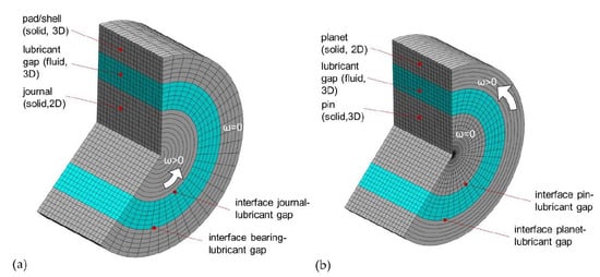 Herein u, v, and w are the flow velocities in the lubricant gap. In comparison to the journal bearing, the three-dimensional part of the solution domain is adjusted to the new requirements and the interface of the three to the two-dimensional section of the solution domain is shifted from the journal radius in Figure 4a to the inner radius of the planet in Figure 4b. At each internal fluid–solid interface, conjugate heat transfer boundary conditions are valid. Temperature-dependent lubricant viscosity is determined using the dynamic viscosity at the reference temperature by the equation of Falz [19].