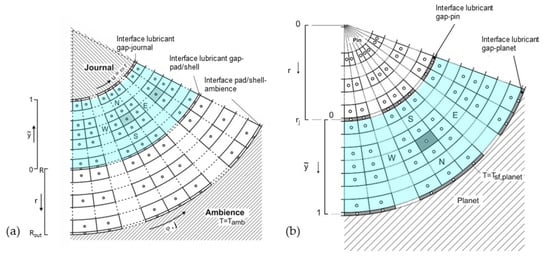 In contrast to the conventional journal bearing, the outer solid body rotates, and the pin is fixed. Therefore, the pin features a stationary temperature profile whereas temperature in circumferential direction homogenizes in the planet due to sufficiently high rotational speeds. Equation (3) includes the governing equations of the temperature model of the planet gear bearing for its three components. Figure 3 visualizes the differences between the discretization of the solution domains of journal and planet gear bearing for the thermal bearing model.
