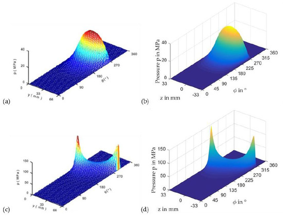 Pressure distributions determined by Sun and Changlin [8] (a,c) and the planet gear bearing code (b,d) for misalignment angles of γ = 0.0° (a,b) and γ = 0.03° (c,d).