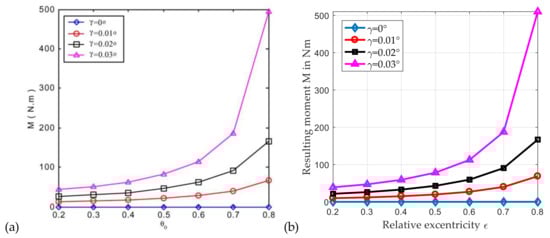 Resulting moment for different levels of misalignment angles determined by Sun and Changlin [8] (a) and the planet gear bearing code (b).