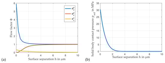 The detailed prediction of flow factors and solid body pressure is not an aim of this study. In fact, these parameters are introduced to apply a consistent bearing model with representative parameters. Flow factors are analyzed based on the average Reynolds equation according to [18]. Results are given in Figure 7a. An application of the theory of Greenwood and Williamson [24] provides a relation between the mean film thickness on the node of the numerical grid and solid contact pressure due to the interaction of the asperities that is shown in Figure 7b. The contact surface features a root mean square roughness value of Rq = 2.83 µm and matches the one earlier presented by the authors in [25]. A turning process generates the surface topography that features small grooves in the circumferential direction. Solid body contact pressure is determined based on the formula proposed by Hu et al. [26]. Consequently, it slightly deviates from the ones presented in [25], which are evaluated differently. The concrete course of the solid body load-carrying capacity has exemplary character in this investigation. Therefore, the contradiction that the theory of Greenwood and Williamson presupposes a normal distribution of the surface roughness that does not exist for the investigated contact surface is accepted here.