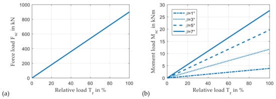Figure 8 illustrates static bearing force and moment load as a function of the relative input torque Tr. Here, 100% Tr correspond to the nominal load situation with a bearing force load of 900 kN according to Table 2. While the force load in Figure 8a is independent of the helix angle, the moment load in Figure 8b strongly depends on it. The distribution of tooth forces to more than one contact due to a profile overlap is neglected in this study.