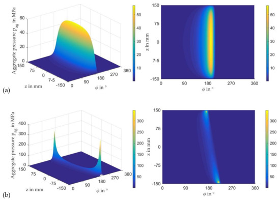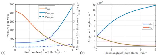 To investigate the impact of helix angle of the helical gear on operating conditions in the lubricant gap, a variation of this parameter is conducted in a range between β = 0° and 8°, assuming a homogenous load distribution on each tooth flank. Consequently, no eccentricity of the tangential mesh forces exists, and according to the conventions in Figure 2b, the resulting moment restored by the bearing Msc results exclusively from My while Mx = 0 Nm. Figure 9 shows the local pressure distribution in the lubricant gap for a straight gear (a) and a helical gear (b) with a helix angle β = 7° in two different views. Here, the term “aggregate pressure” refers to the sum of hydrodynamic and asperity contact pressure. While the aggregate pressure in case (a) purely results from hydrodynamic fluid film, the edge loading in case (b) that is caused by the moment load due to the axial component of the mesh forces involves mixed friction, and therefore, a combination of hydrodynamic and solid contact pressure in the bearing. Moreover, the aggregate pressure significantly increases in case (b) and reaches a level that exceeds the strength level of common sliding bearing materials. In addition to these results, Figure 10 includes the characteristic of minimum film thickness, solid contact and hydrodynamic pressure as well as the alignment between planet and pin as a function of the helix angle. A significant rise of the pressure level exists for helix angles β > 4°. As expected, the load moment My causes an alignment of the bearing about x- and y-axis due to the cross-coupling effects in the fluid film.