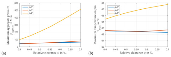 Figure 11 exhibits the impact of the relative clearance on maximum pressure and temperature for different gear helix angles. While a comparably moderate influence of the relative clearance on maximum pressure exists for the lower helix angles of β = 0° and β = 3° in Figure 11a, a very significant change for the practical highly relevant helix angle β = 7° is observable as maximum pressure rises progressively with increasing relative clearance. Moreover, the maximum temperature on the pin sliding surface increases with rising relative clearance in Figure 11b for the maximum helix angle due to contact intensity, whereas a commonly expected decrease in this value is present for β = 0°. Generally, maximum temperature is only slightly higher than the nominal supply temperature, and consequently, thermal effects are not of major importance in this study. Results indicate that relative clearance should be designed as low as possible in the investigated range for β = 7°.