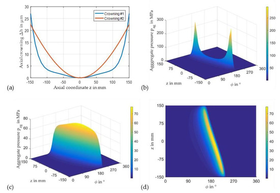 Impact of axial crowning (a) on the pressure distribution: (b) crowning #1, (c,d) crowning #2 (npl = 30 rpm, Fsc = 900 kN, Tsup = 60 °C, psup = 0.2 MPa, β = 7°, Msc = 27.6 kNm).