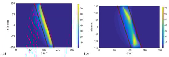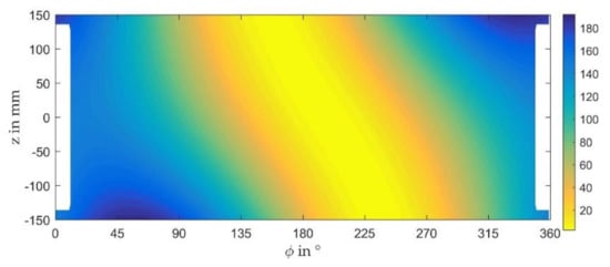 An axial crowning of contact partners with high edge loading is a common measure to reduce local maximum contact intensity. Examples for such applications are rolling element bearings or tooth flanks. To investigate the impact of axial crowning on the performance of the planet gear bearing, two different artificial crowning characteristics are defined according to Figure 12a and applied at nominal load conditions with a helix angle of β ≈ 7°. The first one focuses on profile relief at the bearing edges where maximum pressures occur, according to Figure 9b. The second one exhibits continuous parabolic shaped characteristic across the bearing width. Though the maximum pressure in Figure 12b slightly decreases compared to Figure 9b, the first profile tends to reduce the load-carrying bearing width. However, the second profile provokes a significant reduction of the pressure level. According to Figure 12c,d, a maximum pressure of 77.6 MPa is reached which is approximately 37% higher than the one for the straight tooth flanks in Figure 9a and acceptable for several bearing materials. Figure 12d illustrates the continuous pressure level in axial direction accompanying a homogenous load distribution in the bearing. The main cause for the advantages of the second crowning profile is that edge loading results from the tilting movement of the planet relative to the pin about the axis in load direction. Therefore, the crowning profile involves a comparably high region of nearly constant film thickness at nominal load that starts at ϕ ≈ 160° at z = 150 mm and ends at ϕ ≈ 235° at z = −150 mm, as depicted in Figure 13.