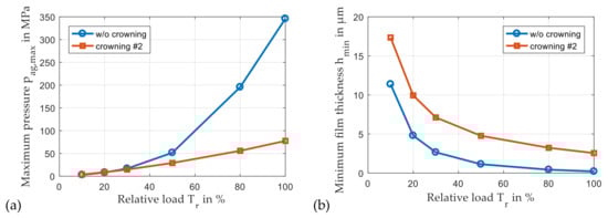In many applications, a geometrical optimization for nominal load conditions accompanies a degradation of the bearing performance in the part-load operating range. Figure 14 contrasts maximum pressure and minimum film thickness for the investigated planet gear bearing with crowning profile #2 and without crowning for relative loads ranging from Tr = 10% to 100%. Results clearly show that the crowning exhibits advantages in the entire investigated load range as maximum pressure decreases and minimum film thickness rises. Moreover, a strictly monotonous characteristic of these parameters can be observed, and operating conditions in the bearing become unfavorably with a rising relative load.