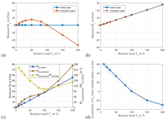 While the previously presented results concordantly assume a homogenous load distribution on the gear mesh, this ideal case is now supplemented by the practical case of a certain tooth flank geometry designed for the nominal load case. The optimization of the tooth flank geometry generally aims to match the previously studied ideal case for the corresponding operating conditions. Consequently, only very low eccentricities of the tangential and radial gear mesh forces to the middle plane of the bearing exist at nominal load conditions. This shape optimization accompanies the eccentricities of these forces for all other load cases. With increasing load, the resulting mesh forces move along the tooth flank from one side of the planet to the other one and across the center plane for the nominal load case. Therefore, a load-dependent derivation of the moments from the ideal case is present and depicted for an artificial tooth flank geometry in Figure 15. According to Figure 15a, a parabolic shape of the characteristic of moment My is assumed between relative loads Tr = 0 and 100%, and a linear one is present in the overload range. The moment Mx in Figure 15b remains unchanged as no shifts are considered between the meshing points of sun and planet gear and planet and ring gear, respectively. In opposite to the ideal case studied so far, the direction of the resulting moment load varies with driving torque. Figure 15c shows a rise of the resulting moment load due to the eccentricity of the tangential mesh forces depicted in Figure 15d. In particular, the moment loads in the part-load region are much higher, as the yellow curve in Figure 15c illustrates.