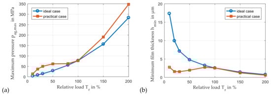 The modified bearing loads are applied to the bearing with crowning #2 and cause a significant modification of the characteristics previously shown in Figure 14. Figure 16 indicates a degradation of the characteristic parameters, in particular, in the part-load range. While the mesh forces, and therefore, the bearing force loads are identical for the practical and ideal case, their application point changes, and the bearing moment load rises. Consequently, the minimum film thickness for the practical case in Figure 16b decreases and is partly below the value predicted for the nominal load case. Moreover, monotonous characteristics of maximum pressure and minimum film thickness do not exist anymore.