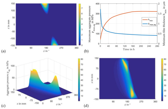 The wear volume Vw is a function of the contact force Fsol, the sliding distance L and the wear coefficient K. It is assumed that the softer material is located on the stator side provoking a two-dimensional variable distribution of wear on the sliding surface of the bearing without axial crowning. In the concrete case, a wear coefficient of and an operation time of t = 280 h at nominal load is assumed. These operating conditions cause significant wear according to Figure 17a. Figure 17b shows the characteristic of the maximum aggregate pressure and minimum film thickness during the run. Here, wear increases minimum film thicknesses and decreases maximum pressure monotonously in the first 160 h. After 160 h a nearly constant level of minimum film thickness close to pure hydrodynamic operation is reached that slightly reduces in the further run. The pressure level decreases monotonously throughout the entire investigated time range. Local maximum pressures tend to shift to the middle plane similar to the behavior observed in the results for crowning #1 in Figure 12b. Nevertheless, maximum pressures significantly reduce as wear accompanies regions of only slightly changed film thickness. To show this phenomenon more clearly, the run time is extended to 560 h. Figure 18b depicts an extension of the load-carrying region in the circumferential direction of the bearing due to wear. Therefore, maximum pressure reaches a level comparable to the one predicted for the unworn bearing with crowning #2 in Figure 12d. Though the pressure is more homogenous in the axial direction with the crowning, Figure 18a indicates that the load-carrying region in the circumferential direction, which is enclosed by the two red lines in both partial figures, is smaller than the one of the worn bearing.
