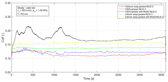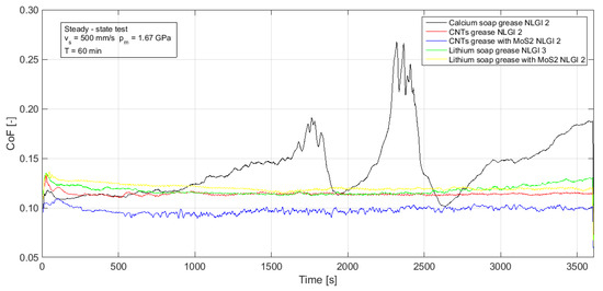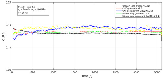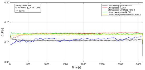 The measurements at a sliding speed of 5 mm/s and initial average hertzian pressure of 1.67 GPa are shown in Figure 4. In these conditions, the friction coefficient values are in the range 0.10–0.13, and for this test, the trend of the graphs is relatively constant. Again, the CoF values are comparable for some samples, such as Lithium soap, Lithium soap with MoS2 additive, and CNTs based grease. Interesting performances are observable for the Calcium soap grease and CNTs based grease with MoS2 additive, whose CoFs are around 0.10. This behavior is expected for these tested samples. As previously explained, the Calcium based grease allows good tribological behavior in non-critical working conditions, e.g., at low temperatures and low speeds, whereas the properties of molybdenum bisulphide and carbon nanotubes, combined in the grease sample increase its tribological characteristics.