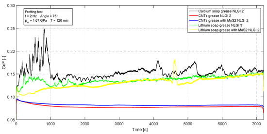 The last set of graphs collected in Figure 6 includes measurements of frictional behavior exhibited by the five grease samples under the characteristic fretting condition by applying sliding alternate motion to the frictional conjunction with frequency 2 Hz. The test length was 120 min with a covered sliding distance of 1131 m. In fretting conditions, unlike the previous ones in which the sliding speed is constant, stability at high speed is not expected for each CoF graph since the oscillating conditions may require a longer running-in time for the tribopairs’ steel surfaces as well as the grease thickener structure. Along with the already exhibited lack of stationarity of the Calcium soap grease, even the Lithium soap and Lithium soap with MoS2 additive show high variability of CoF over the whole 2-h test with average values attaining 0.15, 0.13, respectively.